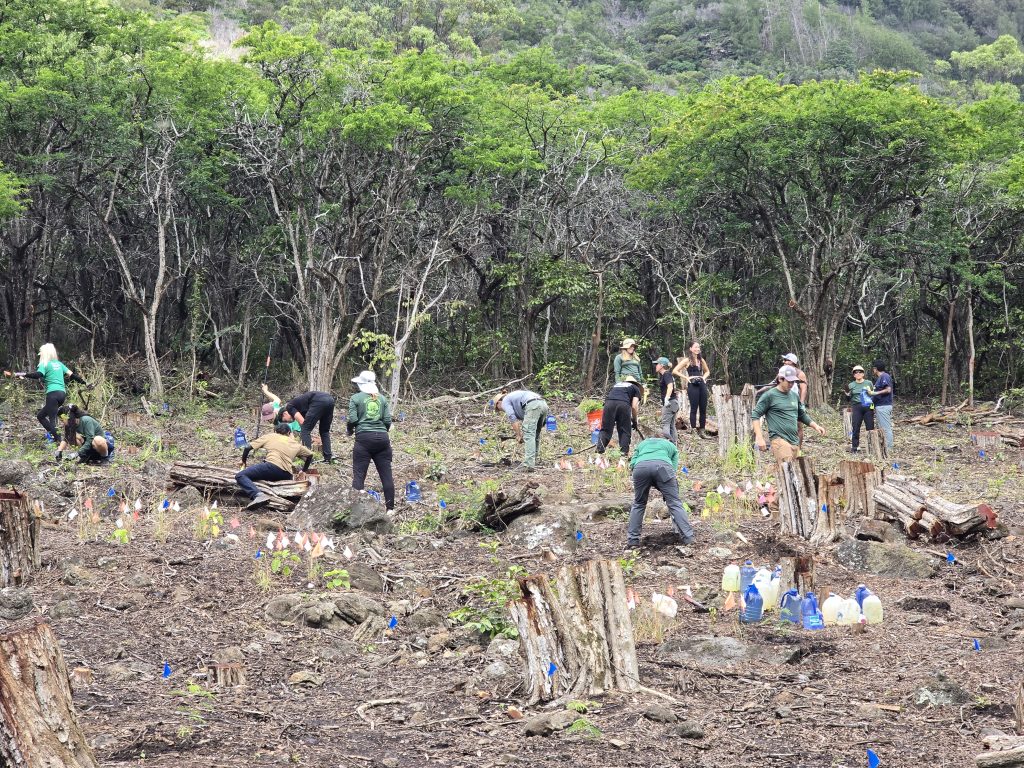 Cultural protocol and ceremony were led by ʻAnakē Keolani Noa, and Pheonix, a high school student from Kamehameha Schools. Wai was used to bless the boundaries of the project, oli (chant) was offered by all participants, and more than 70 native plants were added to the 0.46-acre cleared site.